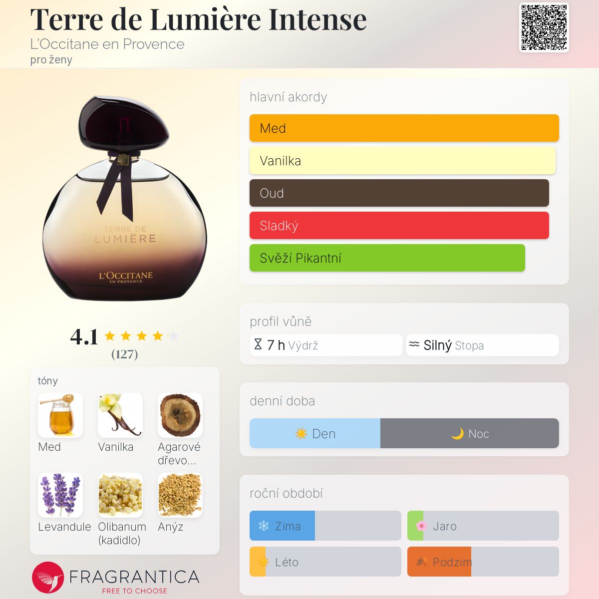 Terre de Lumière Intense podle L'Occitane en Provence je Orientální Vanilla vůně pro ženy. Terre de Lumière Intense byl/a uveden/a v roce 2018. Terre de Lumière Intense byl/a vytvořen/a Nadege Le Garlantezec, Calice Becker a Shyamala Maisondieu. Vrchní tóny jsou Anýz, Růžový pepř a Bergamot; střední tóny jsouMed a Levandule ; základní tóny jsou Vanilka, Agarové dřevo (oud) a Olibanum.