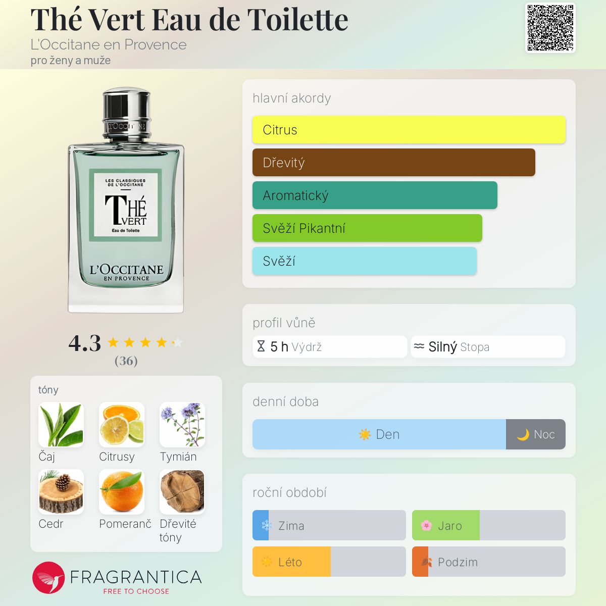 Thé Vert Eau de Toilette podle L'Occitane en Provence je Aromatic vůně pro ženy a muže. Thé Vert Eau de Toilette byl/a uveden/a v roce 2020. Vrchní tóny jsou Citrusy a Pomerančová slupka; střední tón jeZelený čaj ; základní tóny jsou Tymián, Cedr a Dřevité tóny.