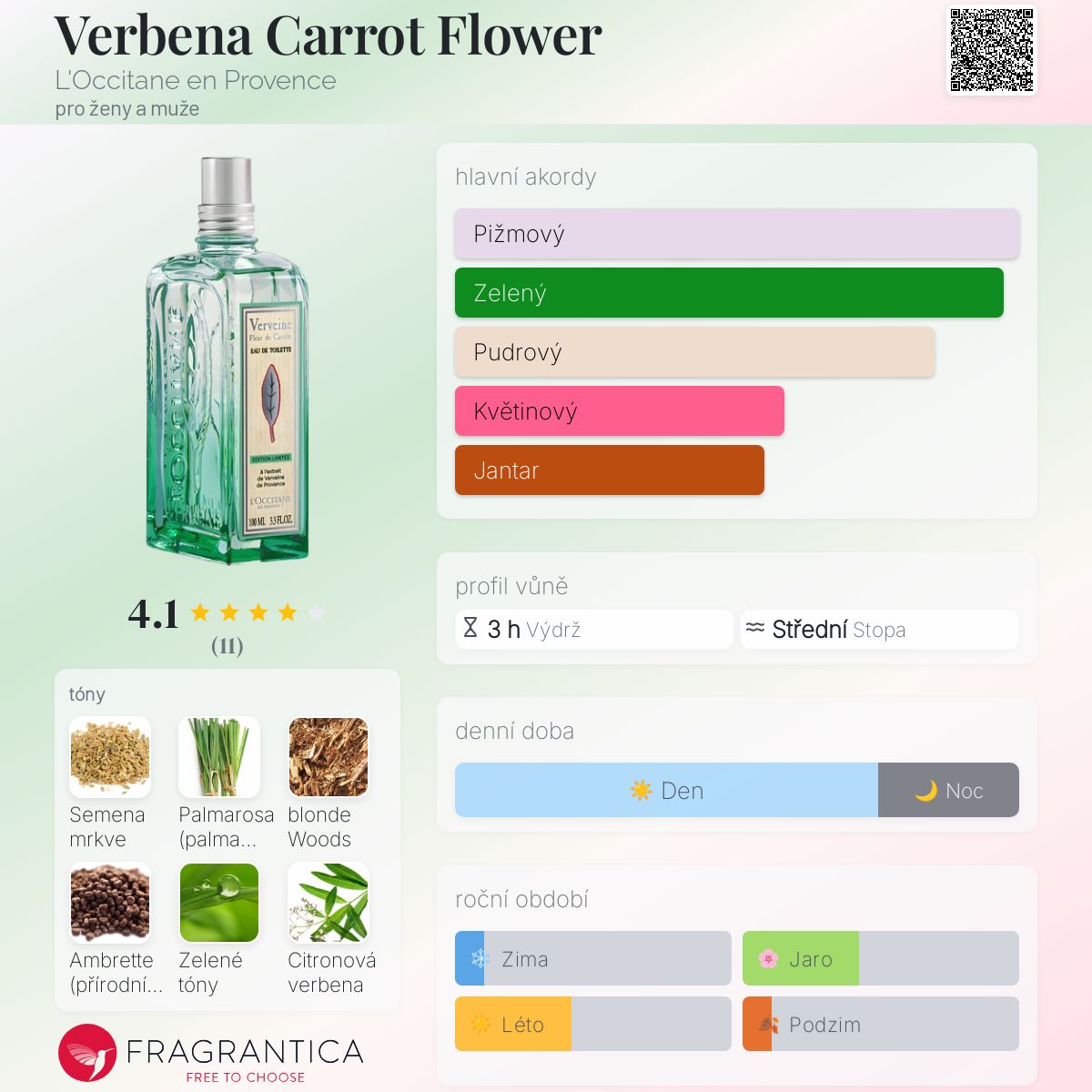 Verbena Carrot Flower podle L'Occitane en Provence je Aromatic Green vůně pro ženy a muže. Toto je nová vůně. Verbena Carrot Flower byl/a uveden/a v roce 2024. Vrchní tóny jsou Palmarosa (palma růžová) a Zelené listí; střední tóny jsouSemena mrkve, Sporýš a Andělika ; základní tóny jsou Světlá dřeva a Ambrette (přírodní pižmo).