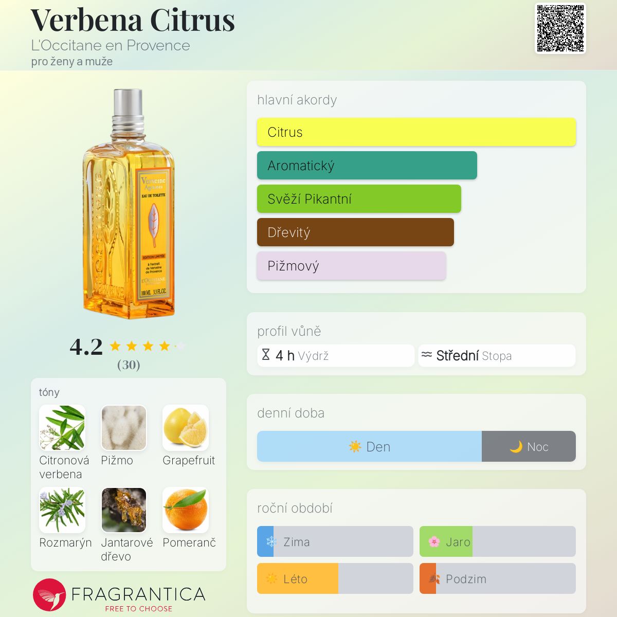 Verbena Citrus podle L'Occitane en Provence je Citrus vůně pro ženy a muže. Toto je nová vůně. Verbena Citrus byl/a uveden/a v roce 2024. Vrchní tóny jsou Grapefruit, Pomeranč a Citrón; střední tóny jsouSporýš, Rozmarýn a Růže ; základní tóny jsou Pižmo a Jantarové dřevo.