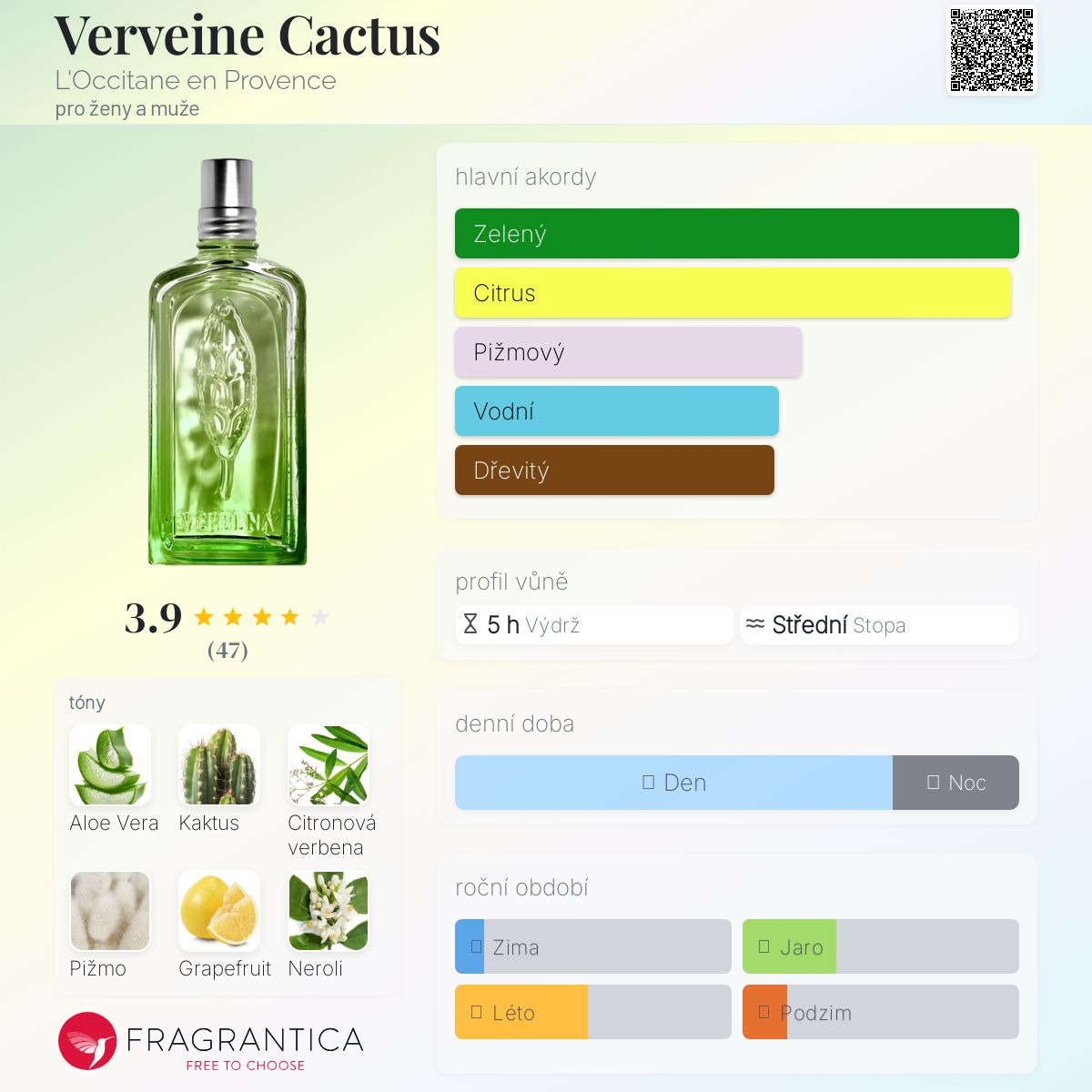 Verveine Cactus podle L'Occitane en Provence je Citrus Aromatic vůně pro ženy a muže. Verveine Cactus byl/a uveden/a v roce 2021. Vrchní tóny jsou Sporýš, Grapefruit a Citrón; střední tóny jsouAloe Vera, Kaktus, Sporýš a Neroli ; základní tóny jsou Pižmo, Pomerančový květ a Petitgrain.