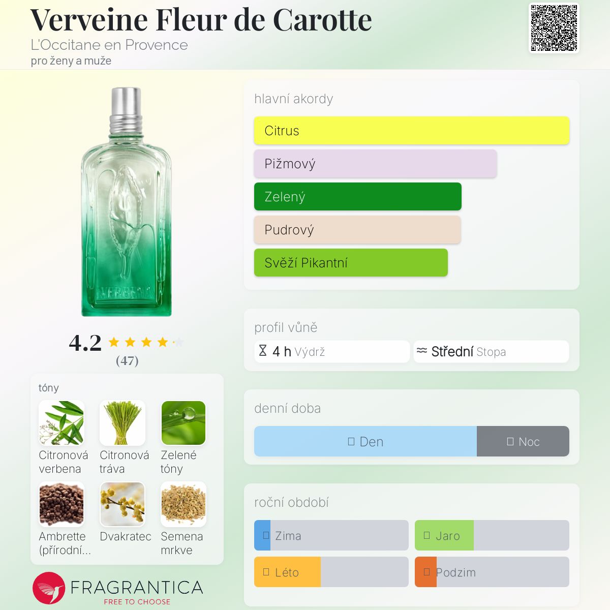 Verveine Fleur de Carotte podle L'Occitane en Provence je vůně pro ženy a muže. Verveine Fleur de Carotte byl/a uveden/a v roce 2023. Vrchní tóny jsou Citronová tráva, Zelené listí a Dvakratec; střední tóny jsouSporýš, Semena mrkve a Andělika ; základní tóny jsou Ambrette (přírodní pižmo), Světlá dřeva a Ambrofix™.