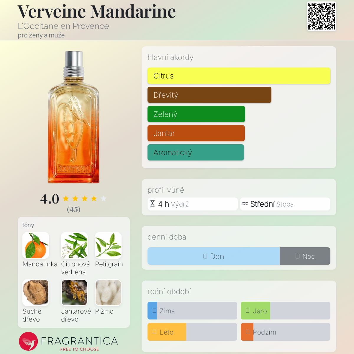 Verveine Mandarine podle L'Occitane en Provence je Citrus Aromatic vůně pro ženy a muže. Verveine Mandarine byl/a uveden/a v roce 2020. Vrchní tóny jsou Zelená mandarinka a Sporýš; střední tóny jsouPetitgrain a Jantarové dřevo ; základní tóny jsou Suché dřevo a Pižmo.