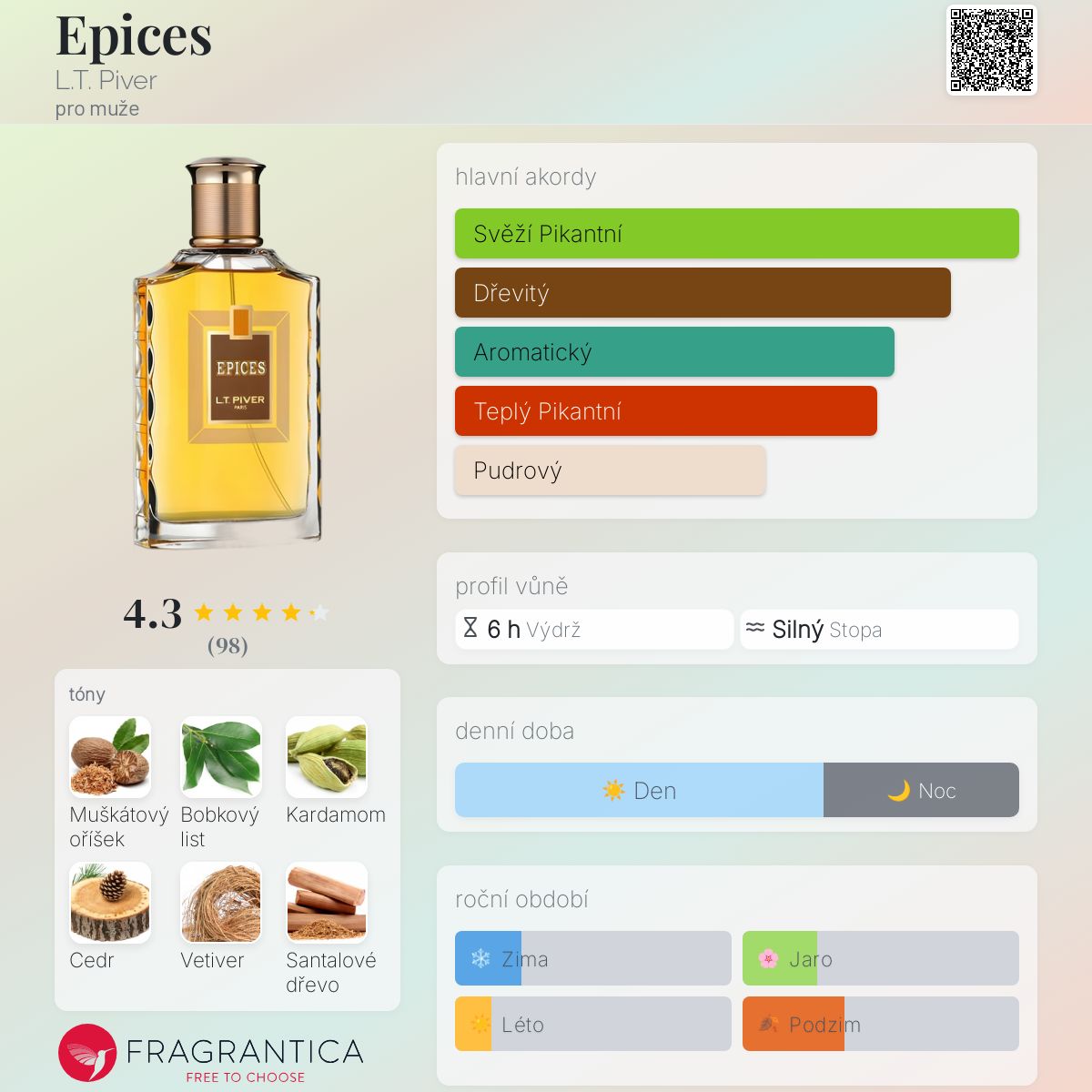Epices podle L.T. Piver je Woody Spicy vůně pro muže. Vrchní tóny jsou Muškátový oříšek, Kardamom, Růžový pepř, Levandule, Bergamot a Kalifornský citrón; střední tóny jsouVavříny, Skořice, Pačuli a Africká pelargonie ; základní tóny jsou Cedr, Haitský vetiver, Santalové dřevo, Kastoreum, Jantar (ambra), Labdanum a Pižmo.