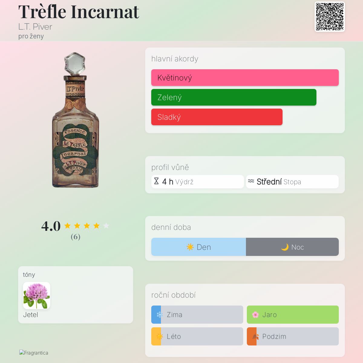 Trèfle Incarnat podle L.T. Piver je vůně pro ženy. Trèfle Incarnat byl/a uveden/a v roce 1898. "Nosem" za touto vůní je Georges Darzens.