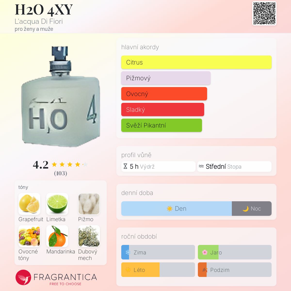 H2O 4XY podle L'acqua Di Fiori je Citrus vůně pro ženy a muže. H2O 4XY byl/a uveden/a v roce 2010. Vrchní tóny jsou Grapefruit, Limetka a Mandarinka; střední tóny jsouOvocné tóny, Frézie, Galbanum a Pelargónie ; základní tóny jsou Pižmo a Dubový mech.