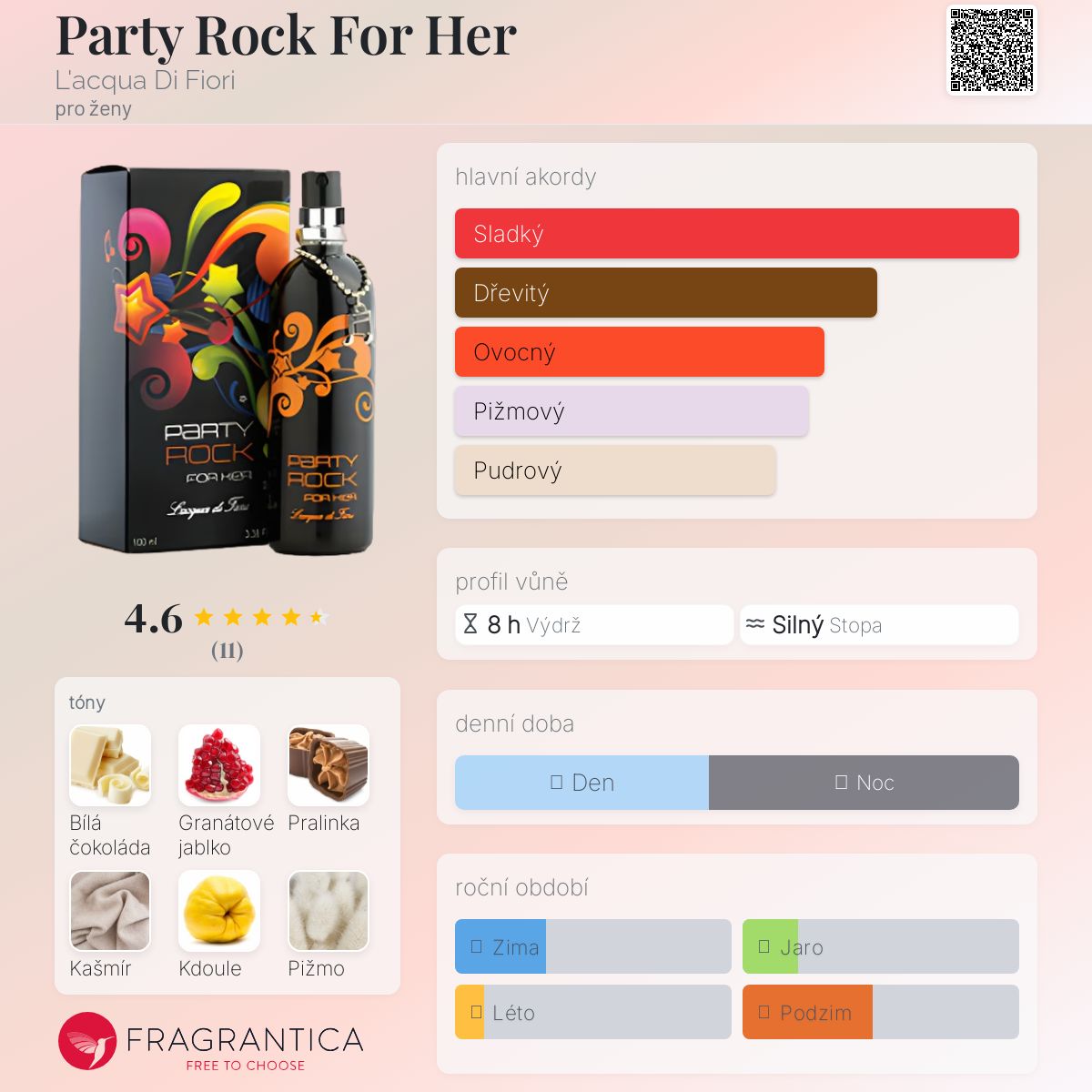 Party Rock For Her podle L'acqua Di Fiori je Orientální Vanilla vůně pro ženy. Party Rock For Her byl/a uveden/a v roce 2012. Vrchní tóny jsou Granátové jablko a Kdoule; střední tóny jsouBílá čokoláda a Pralinka ; základní tóny jsou Kašmír a Pižmo.