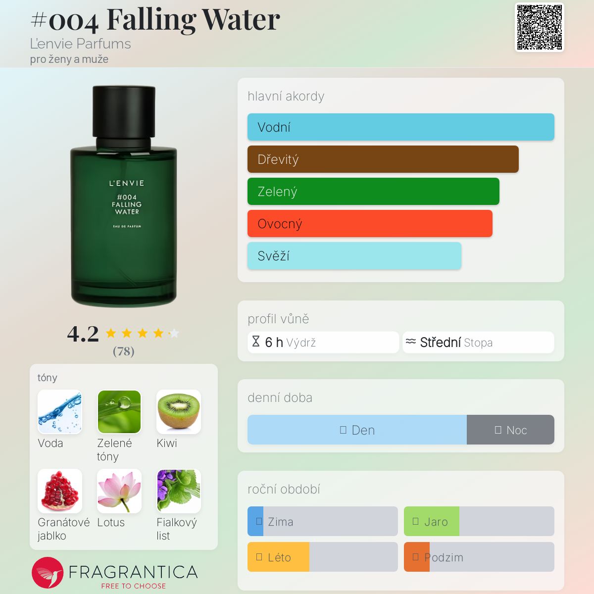 #004 Falling Water podle L’envie Parfums je Aromatic Aquatic vůně pro ženy a muže. #004 Falling Water byl/a uveden/a v roce 2019. #004 Falling Water byl/a vytvořen/a Isaac Sinclair a Fanny Grau. Vrchní tóny jsou Vodnaté tóny, Kiwi, Granátové jablko, Jalovcové bobulky, Citrón a Mandarinka; střední tóny jsouZelené listí, Lotus a Fialkové listy ; základní tóny jsou Cedr, Vetiver, Pižmo a Jantar (ambra).