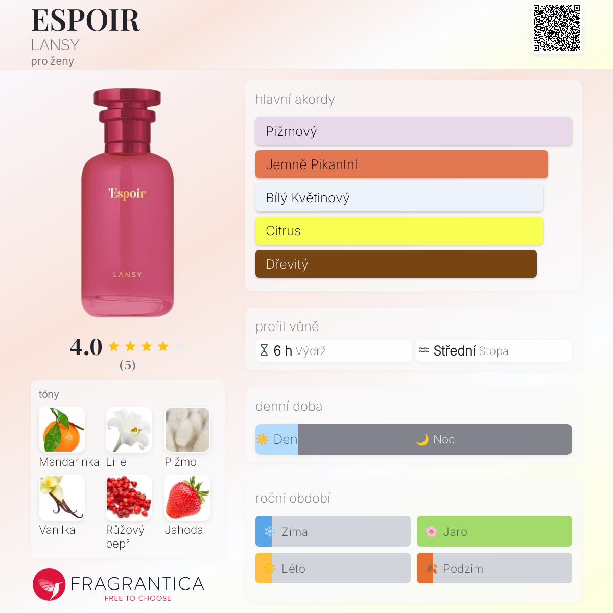 ESPOIR podle LANSY je Floral Fruity vůně pro ženy. ESPOIR byl/a uveden/a v roce 2023. Vrchní tóny jsou Mandarinka, Růžový pepř a Jahoda; střední tóny jsouLilie a Clearwood ; základní tóny jsou Pižmo, Vanilka, Jantar (ambra) a List indonéského pačuli.