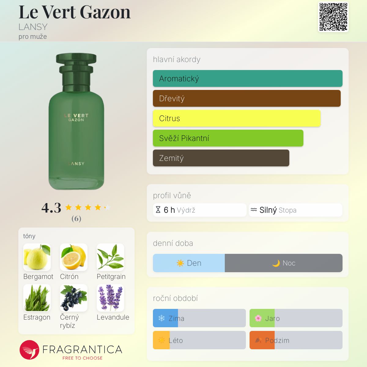 Le Vert Gazon podle LANSY je Woody Floral Musk vůně pro muže. Le Vert Gazon byl/a uveden/a v roce 2023. Vrchní tóny jsou Bergamot, Citrón, Petitgrain a Estragon; střední tóny jsouČerný rybíz, Levandule, Konvalinka, Muškátový oříšek a Růže ; základní tóny jsou Pižmo, Dubový mech, Vetiver, Santalové dřevo a Pačuli.