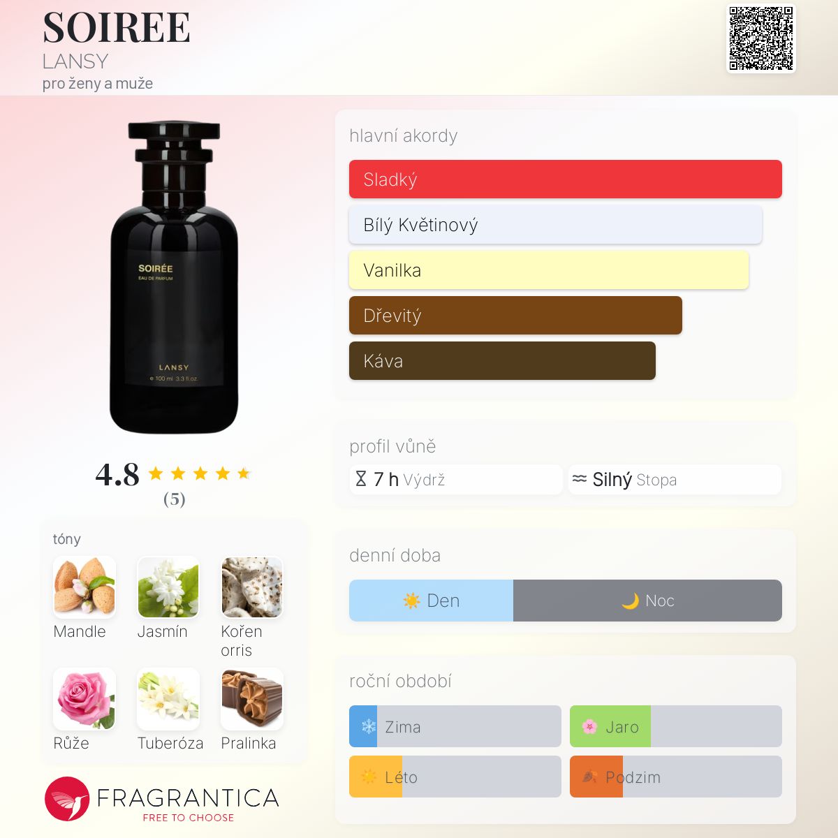 SOIREE podle LANSY je Orientální Vanilla vůně pro ženy a muže. SOIREE byl/a uveden/a v roce 2020. Vrchní tón je Mandle ; střední tóny jsouJasmín, Orris, Růže, Tuberóza a Pralinka ; základní tóny jsou Káva, Guajakové dřevo, Agarové dřevo (oud), Fazole tonka a Vanilka.