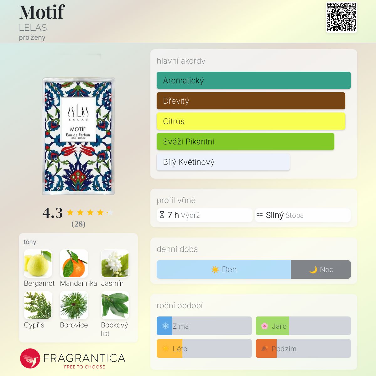 Motif podle LELAS je Floral vůně pro ženy. Motif byl/a uveden/a v roce 2016. Vrchní tóny jsou Bergamot a Mandarinka; střední tón jeJasmín ; základní tóny jsou Cypřiš, Borovice a Bobkový list.