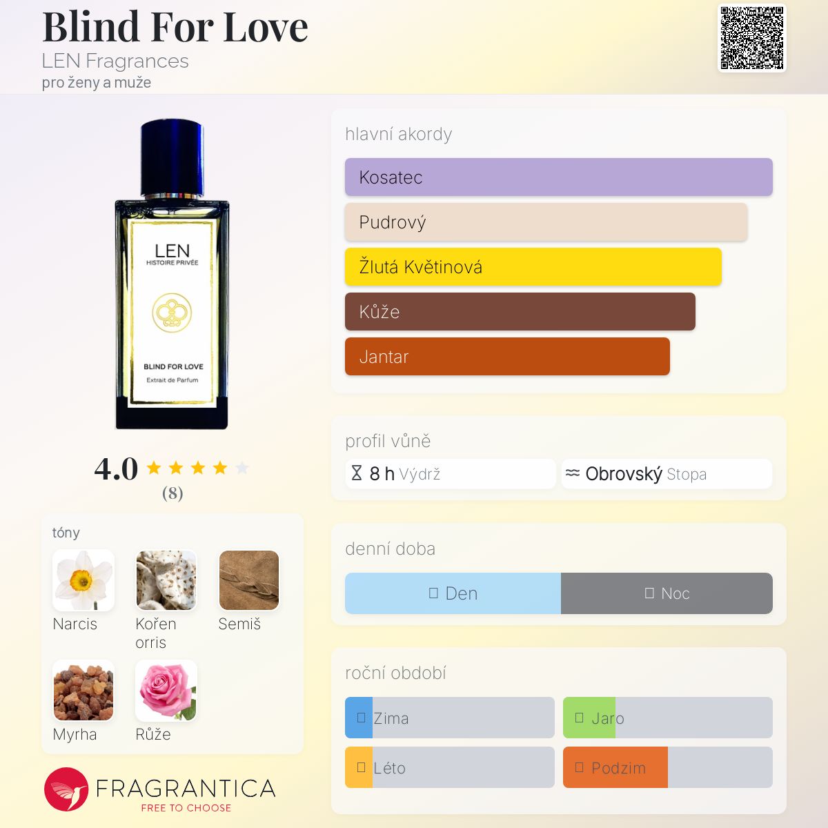 Blind For Love podle LEN Fragrances je Orientální Floral vůně pro ženy a muže. Blind For Love byl/a uveden/a v roce 2023. "Nosem" za touto vůní je David Chieze. Vrchní tón je Narcis ; střední tóny jsouOrris a Turecká růže ; základní tóny jsou Semiš a Myrha.