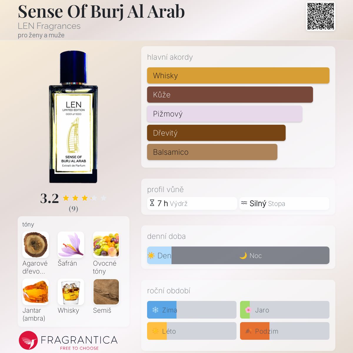 Sense Of Burj Al Arab podle LEN Fragrances je Orientální Woody vůně pro ženy a muže. Sense Of Burj Al Arab byl/a uveden/a v roce 2023. "Nosem" za touto vůní je Sidonie Grandperret. Vrchní tóny jsou Agarové dřevo (oud), Ovocné tóny a Whisky; střední tóny jsouŠafrán a Semiš ; základní tóny jsou Jantar (ambra) a Myrha.