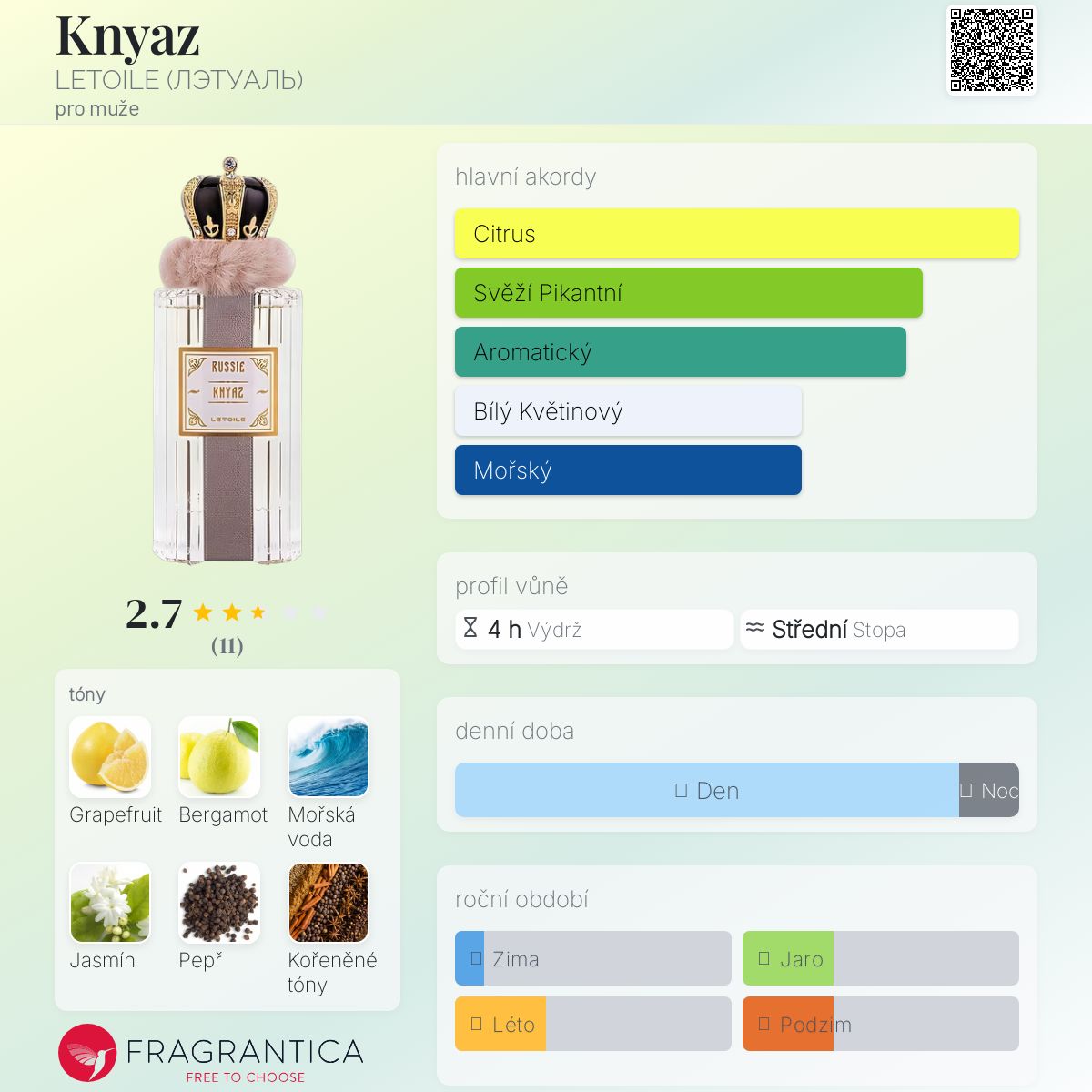 Knyaz podle LETOILE (ЛЭТУАЛЬ) je Woody Spicy vůně pro muže. Toto je nová vůně. Knyaz byl/a uveden/a v roce 2025. Vrchní tóny jsou Grapefruit, Bergamot, Pepř, Koření, Citrón a Máta; střední tóny jsouVodní tóny, Jasmín, Zázvor, Ovocné tóny a Muškátový oříšek ; základní tóny jsou Cedr, Labdanum, Jantar (ambra), Santalové dřevo a Pačuli.