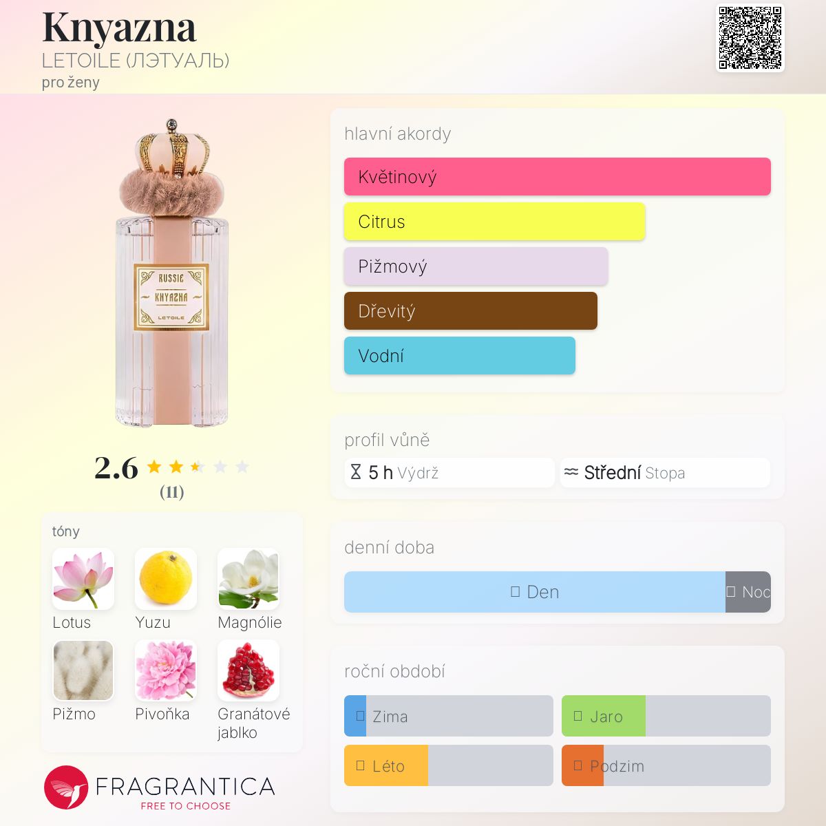 Knyazna podle LETOILE (ЛЭТУАЛЬ) je Floral Fruity vůně pro ženy. Toto je nová vůně. Knyazna byl/a uveden/a v roce 2025. Vrchní tóny jsou Yuzu a Granátové jablko; střední tóny jsouLotus, Magnólie a Pivoňka ; základní tóny jsou Pižmo, Dřevité tóny a Jantar (ambra).