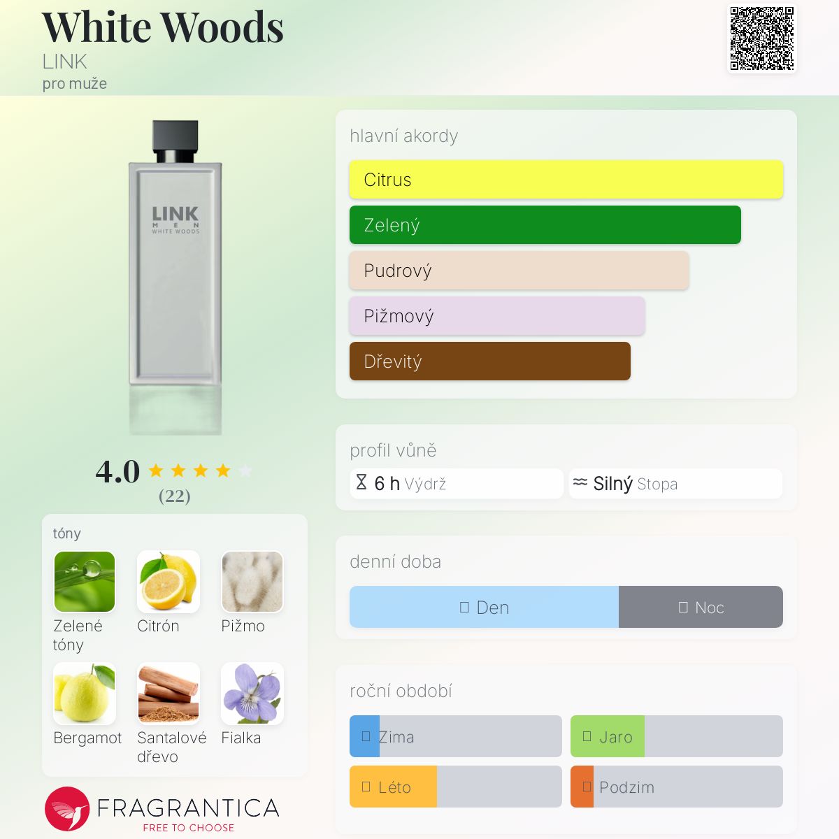 White Woods podle LINK je Woody Floral Musk vůně pro muže. White Woods byl/a uveden/a v roce 2003. "Nosem" za touto vůní je Pierre-Constantin Guéros. Vrchní tóny jsou Zelené tóny, Citrón a Bergamot; střední tóny jsouFialka a Jasmín ; základní tóny jsou Pižmo, Santalové dřevo a Jantar (ambra).
