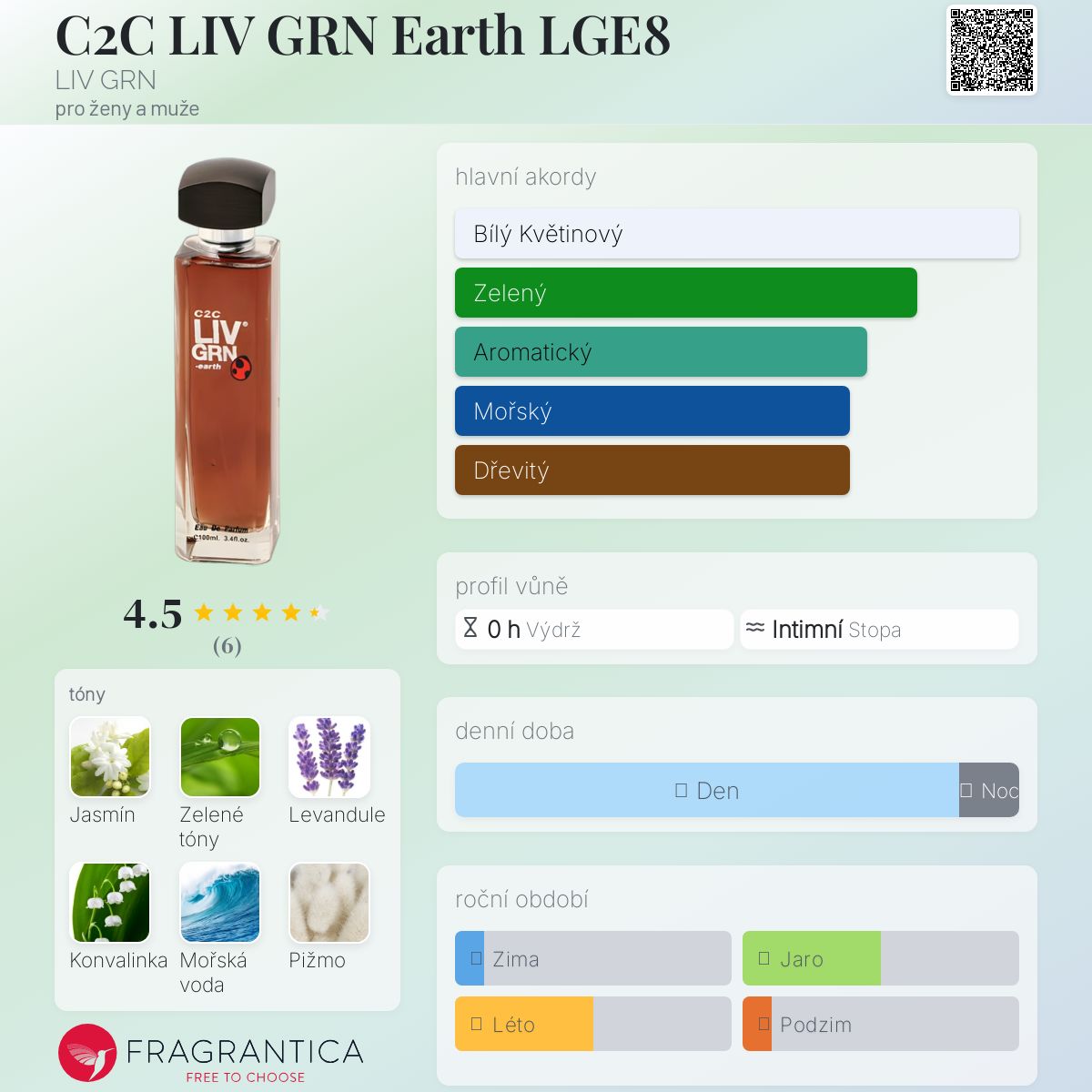 C2C LIV GRN Earth LGE8 podle LIV GRN je Aromatic Aquatic vůně pro ženy a muže. C2C LIV GRN Earth LGE8 byl/a uveden/a v roce 2011. Vrchní tóny jsou Jasmín a Zelené tóny; střední tóny jsouLevandule, Konvalinka a Mořská voda ; základní tóny jsou Pižmo a Santalové dřevo.