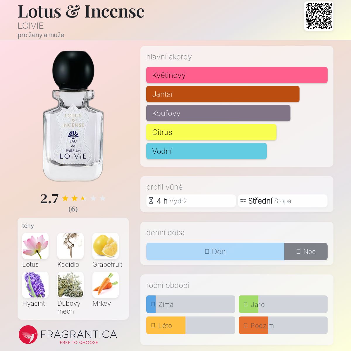 Lotus & Incense podle LOIVIE je Floral vůně pro ženy a muže. Toto je nová vůně. Lotus & Incense byl/a uveden/a v roce 2023. Vrchní tóny jsou Grapefruit a Mrkev; střední tóny jsouLotus a Hyacint ; základní tóny jsou Kadidlo a Mech.