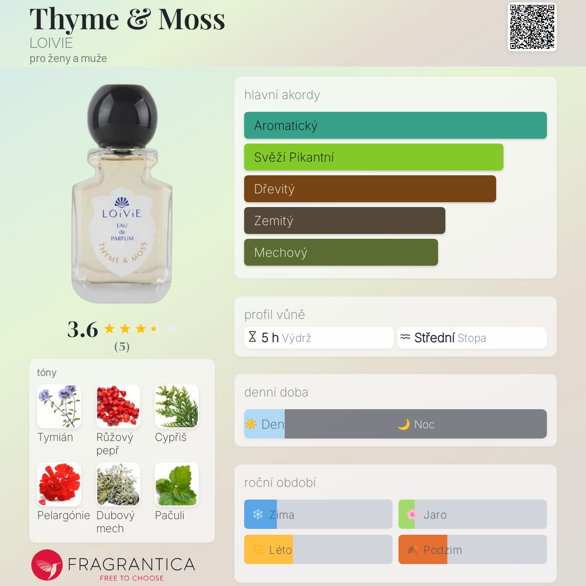 Thyme & Moss podle LOIVIE je Woody Aromatic vůně pro ženy a muže. Thyme & Moss byl/a uveden/a v roce 2023. Vrchní tóny jsou Tymián a Růžový pepř; střední tóny jsouCypřiš a Pelargónie ; základní tóny jsou Mech a Pačuli.