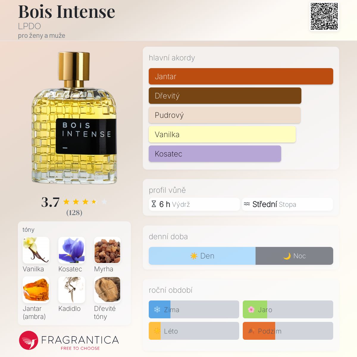 Bois Intense podle LPDO je vůně pro ženy a muže. Bois Intense byl/a uveden/a v roce 2020. Vrchní tóny jsou Toskánský kosatec, Kadidlo, Cypřiš a Jalovcové bobulky; střední tóny jsouVanilka, Myrha, Pižmo a Pačuli ; základní tóny jsou Jantar (ambra), Dřevité tóny, Med a Kůže.