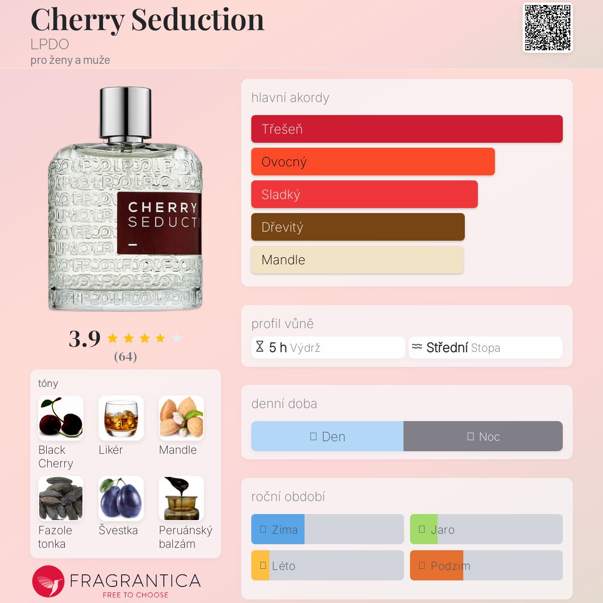 Cherry Seduction podle LPDO je vůně pro ženy a muže. Toto je nová vůně. Cherry Seduction byl/a uveden/a v roce 2024. Vrchní tóny jsou Černá třešeň, Likér a Hořká mandle; střední tóny jsouČerná třešeň, Švestka, Turecká růže a Jasmín Sambac ; základní tóny jsou Fazole tonka, Peruánský balzám, Cedr, Pačuli a Vetiver.