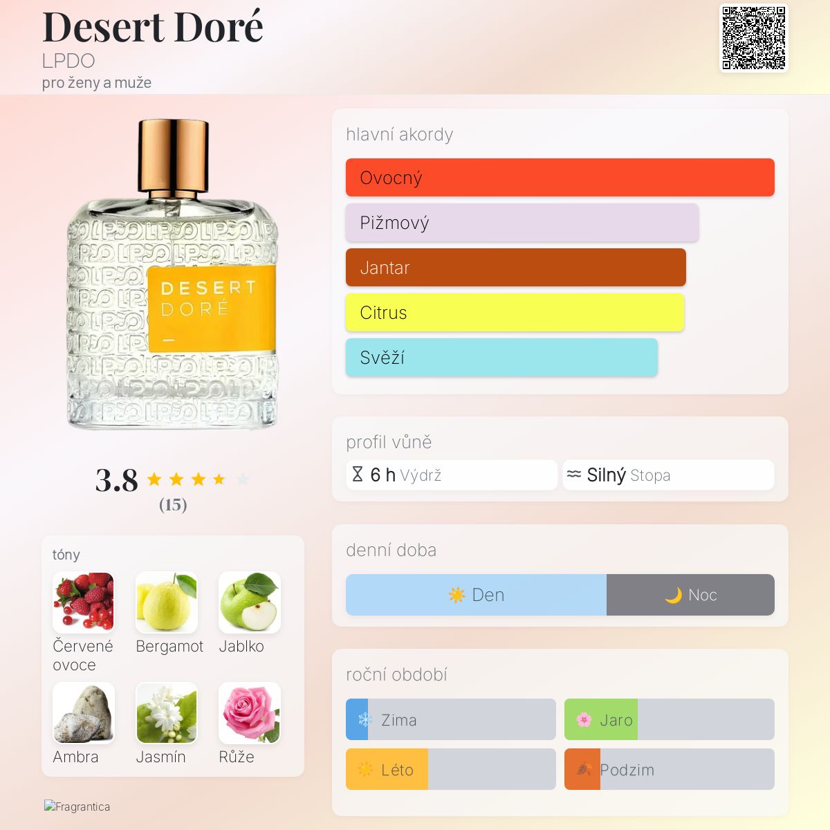 Desert Doré podle LPDO je Floral Fruity vůně pro ženy a muže. Toto je nová vůně. Desert Doré byl/a uveden/a v roce 2025. Vrchní tóny jsou Červené ovoce, Bergamot a Jablko; střední tóny jsouAmbra, Jasmín a Růže ; základní tóny jsou Karamel, Pižmo a Kašmírové dřevo.