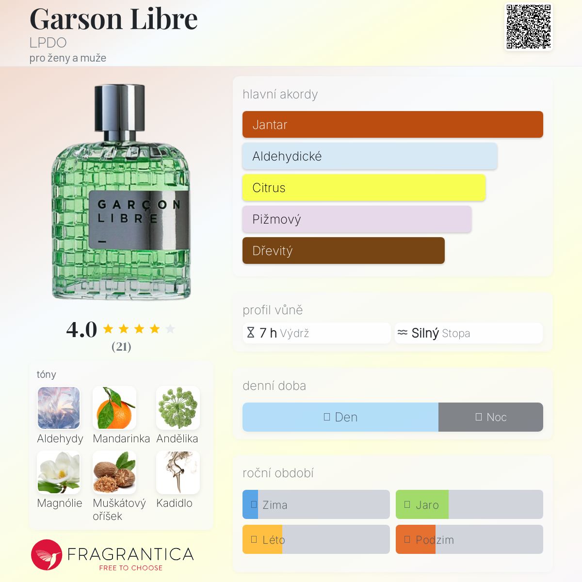 Garson Libre podle LPDO je vůně pro ženy a muže. Garson Libre byl/a uveden/a v roce 2020. Vrchní tóny jsou Aldehydy, Mandarinka, Andělika a Maté; střední tóny jsouMagnólie, Muškátový oříšek, Kmín, Skořice, Koriandr a Jamajský pepř ; základní tóny jsou Kadidlo, Vetiver, Jantar (ambra), Pačuli, Cedr a Labdanum.
