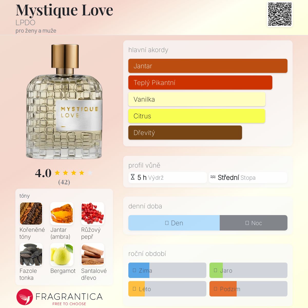 Mystique Love podle LPDO je vůně pro ženy a muže. Mystique Love byl/a uveden/a v roce 2023. Vrchní tóny jsou Růžový pepř, Bergamot a Sladký pomeranč; střední tóny jsouKoření, Damašská růže a Jasmín ; základní tóny jsou Jantar (ambra), Fazole tonka, Santalové dřevo, Vanilka, Cedr a Dubový mech.
