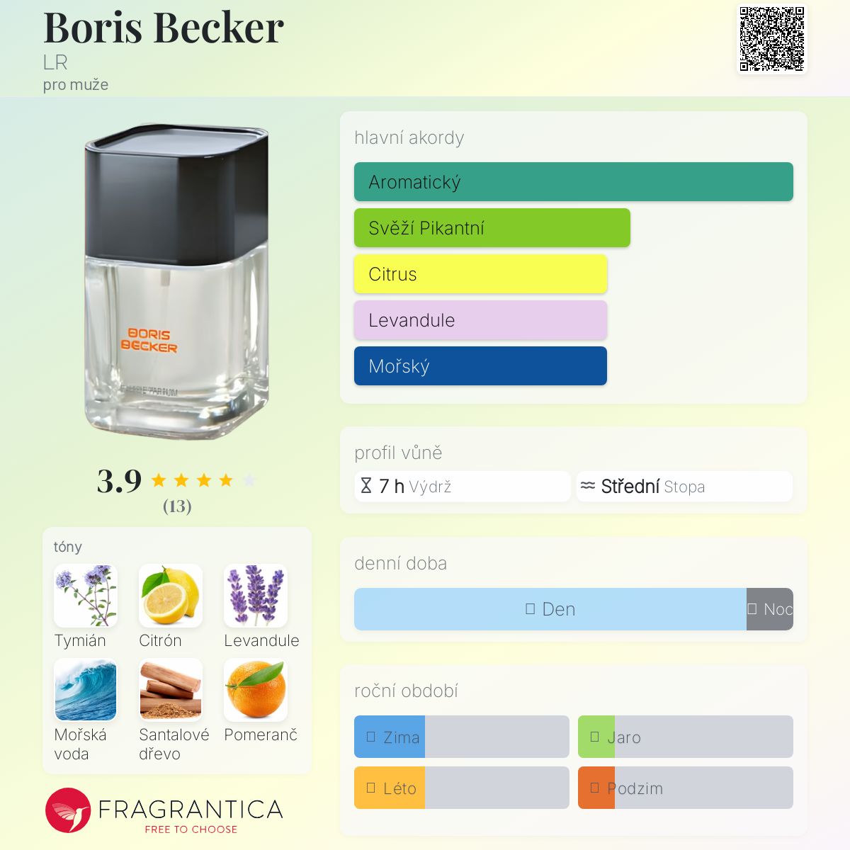 Boris Becker podle LR je Aromatic Aquatic vůně pro muže. Boris Becker byla spuštěna během 2000. Vrchní tóny jsou Citron amalfi a Pomeranč; střední tóny jsouTymián, Levandule a Mořská voda ; základní tón je Santalové dřevo.