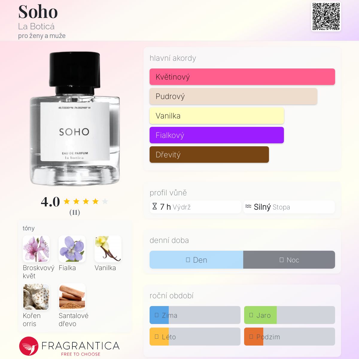 Soho podle La Boticá je Floral Green vůně pro ženy a muže. Soho byl/a uveden/a v roce 2021. Vrchní tóny jsou Broskvový květ a Fialka; střední tóny jsouVanilka a Orris ; základní tón je Santalové dřevo.