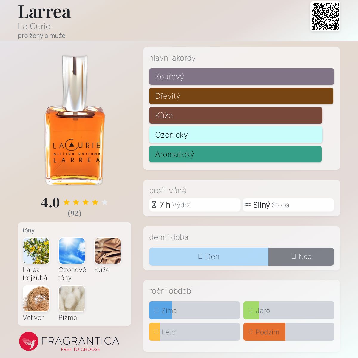 Larrea podle La Curie je Leather vůně pro ženy a muže. Larrea byl/a uveden/a v roce 2014. "Nosem" za touto vůní je Lesli Wood Peterson.