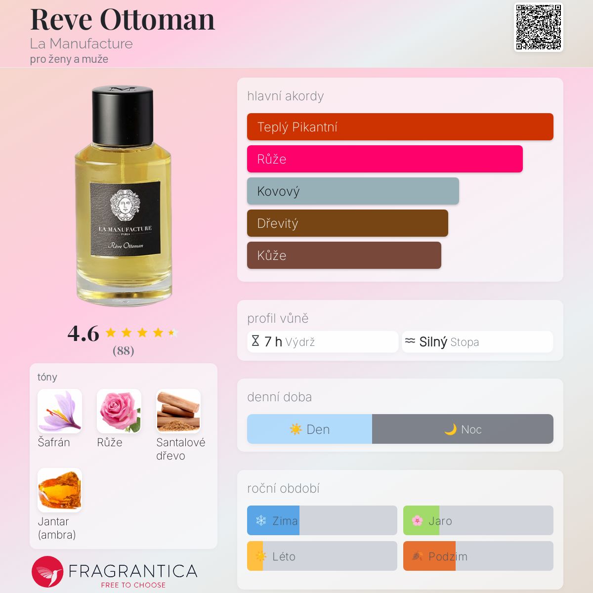 Reve Ottoman podle La Manufacture je Orientální Floral vůně pro ženy a muže. Reve Ottoman byl/a uveden/a v roce 2019. "Nosem" za touto vůní je Carla Chabert. Vrchní tón je Šafrán ; střední tón jeTurecká růže ; základní tóny jsou Santalové dřevo a Jantar (ambra).