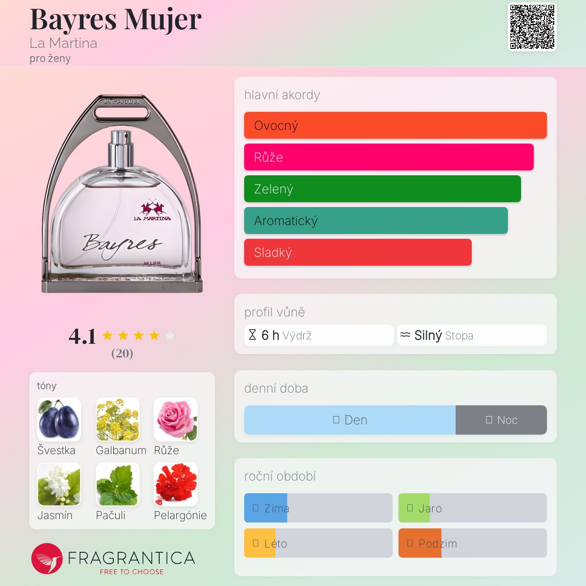 Bayres Mujer podle La Martina je Chypre Floral vůně pro ženy. Bayres Mujer byl/a uveden/a v roce 2007. "Nosem" za touto vůní je Michel Garnero. Vrchní tóny jsou Galbanum a Kokos; střední tóny jsouŠvestka, Růže, Jasmín a Pelargónie ; základní tóny jsou Pačuli, Santalové dřevo, Jantar (ambra) a Vanilka.