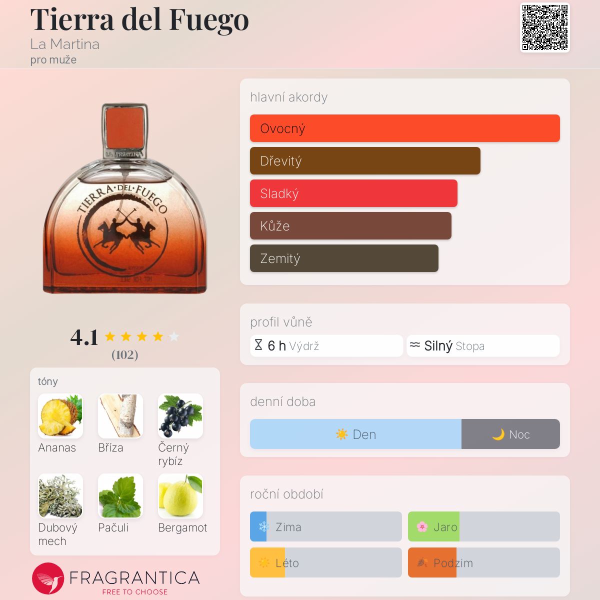 Tierra del Fuego podle La Martina je Floral Woody Musk vůně pro muže. Tierra del Fuego byl/a uveden/a v roce 2012. Vrchní tóny jsou Ananas, Černý rybíz, Bergamot a Jablko; střední tóny jsouBříza, Pačuli, Jasmín a Růže ; základní tóny jsou Dubový mech, Pižmo, Jantar (ambra) a Vanilka.