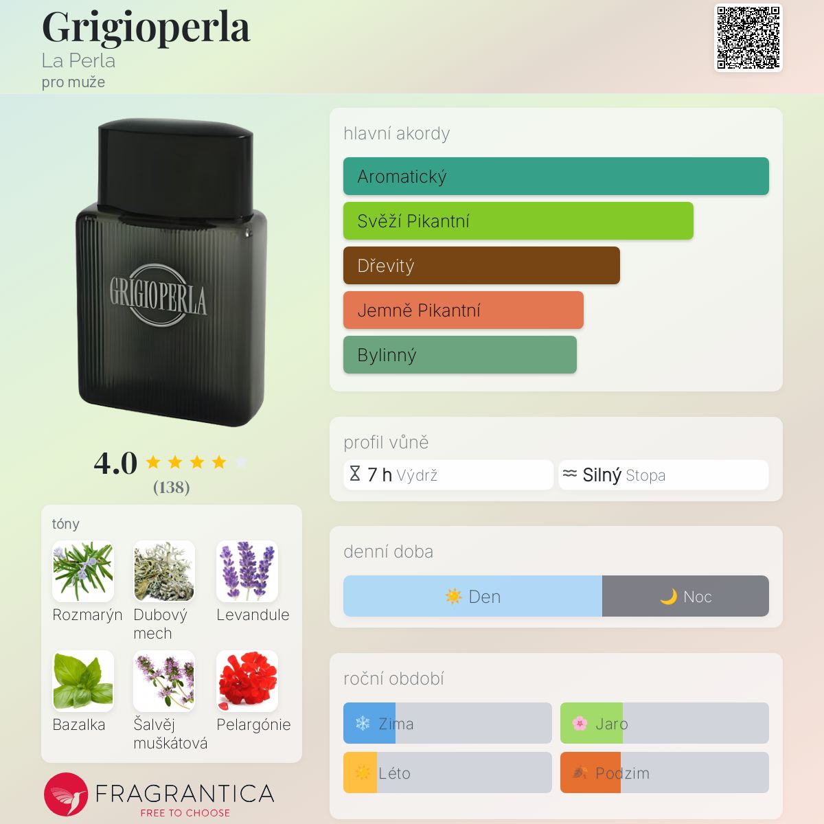 Grigioperla podle La Perla je Orientální Fougere vůně pro muže. Grigioperla byl/a uveden/a v roce 1991. Vrchní tóny jsou Rozmarýn, Levandule, Bazalka, Koriandr, Anýz a Bergamot; střední tóny jsouŠalvěj muškátová, Pelargónie a Karafiát ; základní tóny jsou Dubový mech, Santalové dřevo, Kůže, Jantar (ambra), Cedr, Fazole tonka a Pižmo.