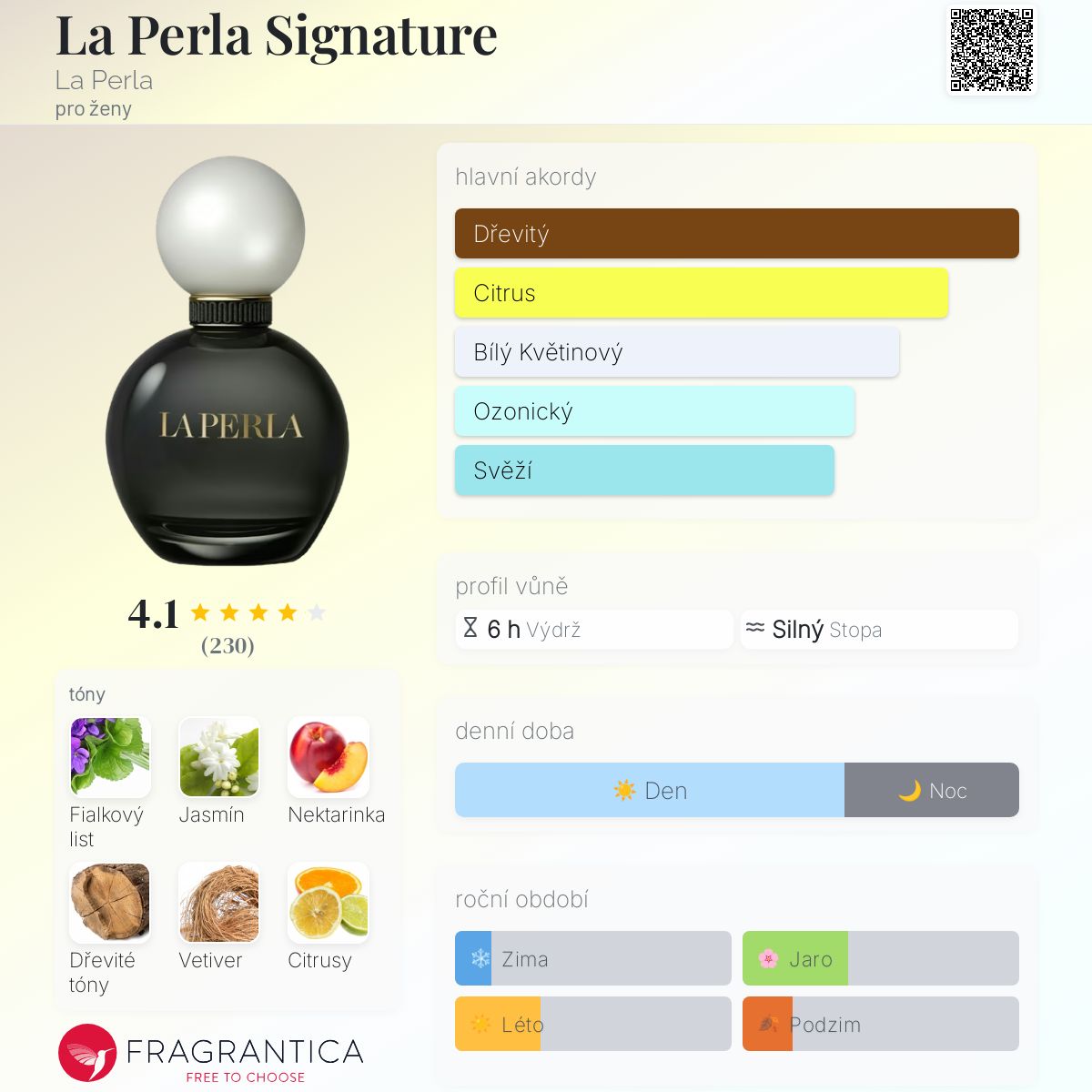 La Perla Signature podle La Perla je Floral vůně pro ženy. La Perla Signature byl/a uveden/a v roce 2021. "Nosem" za touto vůní je Louise Turner. Vrchní tóny jsou Fialkové listy, Citrusy, Mandarinka a Neroli; střední tóny jsouJasmín Sambac a Nektarinka ; základní tóny jsou Dřevité tóny, Vetiver a Cedr.