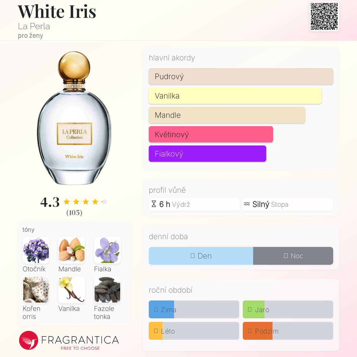 White Iris podle La Perla je Floral vůně pro ženy. White Iris byl/a uveden/a v roce 2015. Vrchní tóny jsou Fialka, Bergamot a Jasmín; střední tóny jsouOtočník, Mandle a Orris ; základní tóny jsou Vanilka, Fazole tonka a Ambroxan.