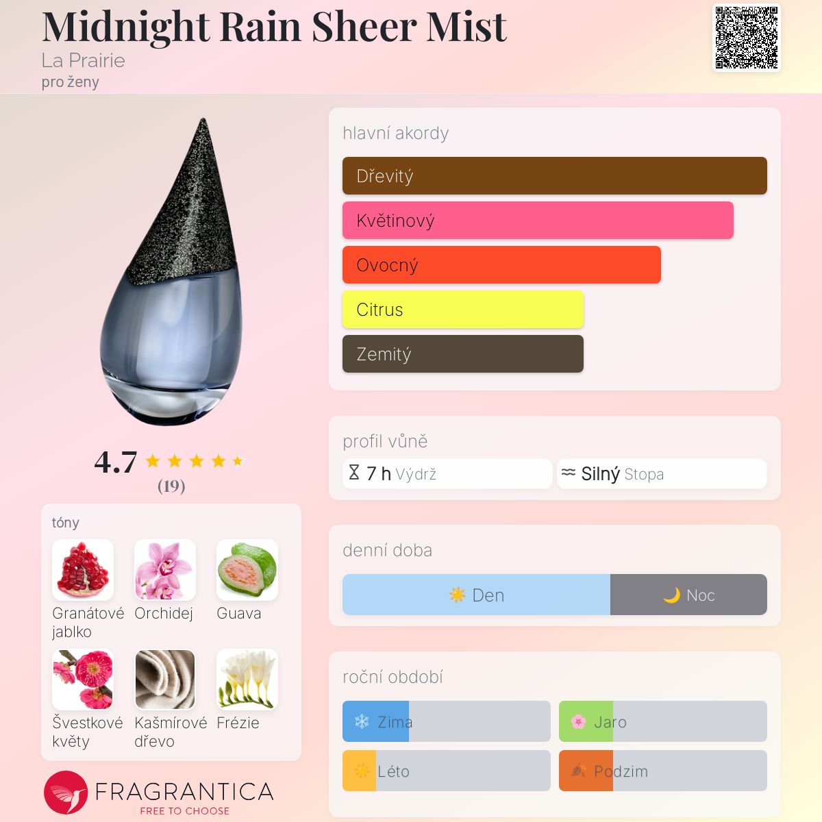 Midnight Rain Sheer Mist podle La Prairie je Chypre Floral vůně pro ženy. Midnight Rain Sheer Mist byl/a uveden/a v roce 2009. Vrchní tóny jsou Granátové jablko, Guava, Frézie a Mandarinka; střední tóny jsouOrchidej, Švestkové květy, Bílá lilie a Jantar (ambra) ; základní tóny jsou Kašmírové dřevo, Pačuli, Vetiver a Pižmo.