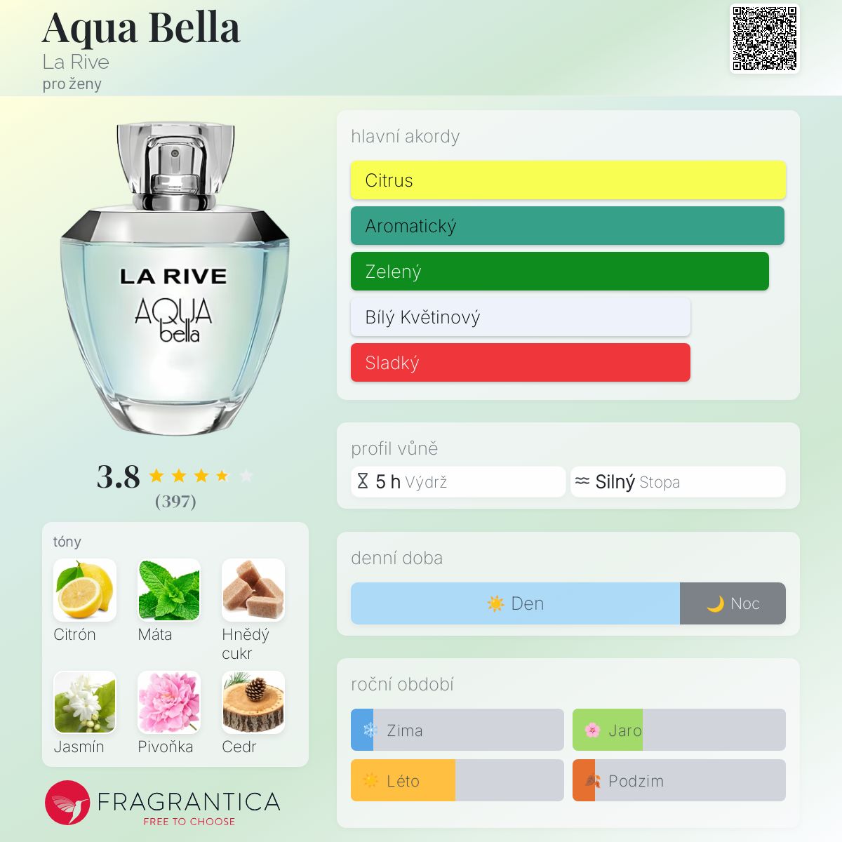 Aqua Bella podle La Rive je Floral Green vůně pro ženy. Aqua Bella byl/a uveden/a v roce 2014. Vrchní tóny jsou Citrón a Máta; střední tóny jsouJasmín, Pivoňka a Růžový pepř ; základní tóny jsou Hnědý cukr, Cedr a Labdanum.