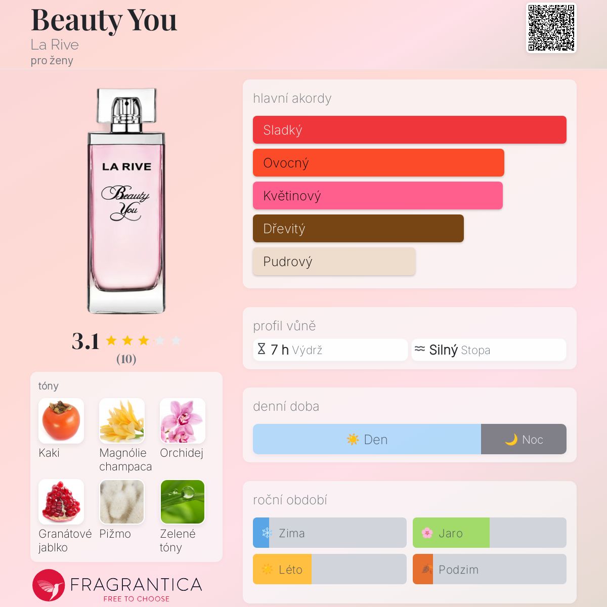 Beauty You podle La Rive je Floral vůně pro ženy. Vrchní tóny jsou Kaki, Granátové jablko a Zelené tóny; střední tóny jsouMagnólie champaca, Černá orchidej a Lotus ; základní tóny jsou Pižmo, Dřevité tóny, Pačuli a Jantar (ambra).