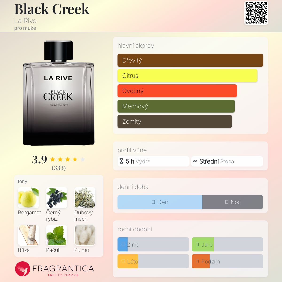 Black Creek podle La Rive je Floral Woody Musk vůně pro muže. Black Creek byl/a uveden/a v roce 2017. Vrchní tóny jsou Bergamot a Černý rybíz; střední tóny jsouBříza, Pačuli, Růže a Jasmín ; základní tóny jsou Dubový mech, Pižmo, Jantar (ambra) a Vanilka.