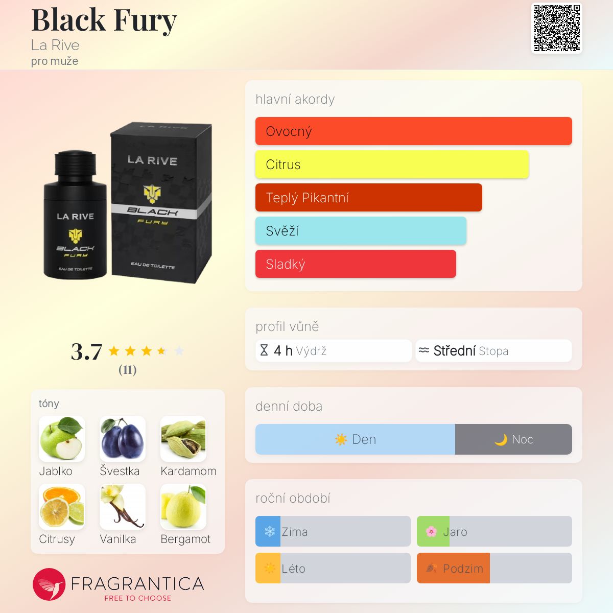 Black Fury podle La Rive je Aromatic Fougere vůně pro muže. Black Fury byla spuštěna během 2020. Vrchní tóny jsou Jablko, Švestka, Citrusy, Bergamot a Limetka; střední tóny jsouKardamom, Skořice, Růže a Jasmín ; základní tóny jsou Vanilka, Cedr, Jantar (ambra) a Pižmo.