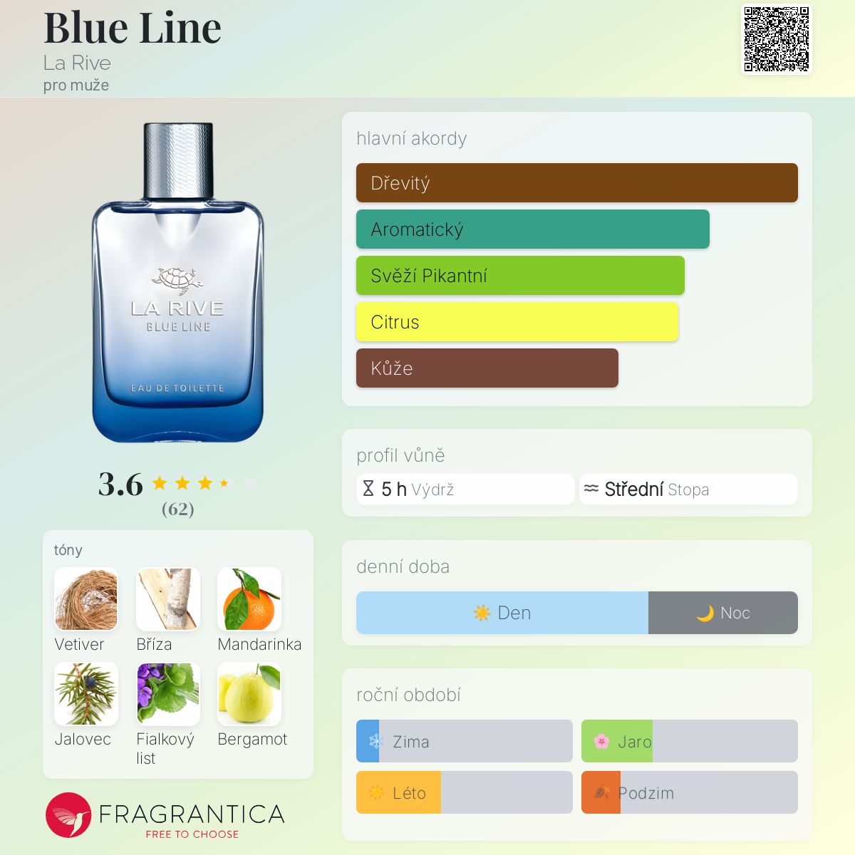 Blue Line podle La Rive je Citrus Aromatic vůně pro muže. Vrchní tóny jsou Březový list, Mandarinka a Bergamot; střední tóny jsouVetiver, Jalovec, Fialkový list, Pepř, Cedr a Santalové dřevo ; základní tóny jsou Pačuli, Pižmo, Vanilka a Jantar (ambra).