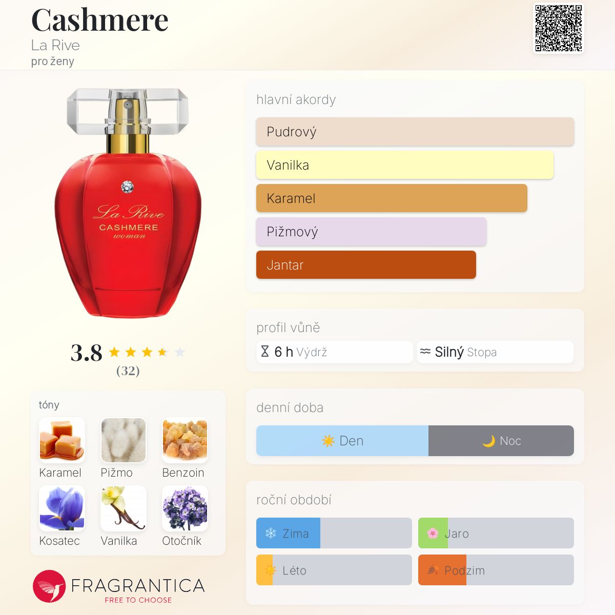 Cashmere podle La Rive je Floral vůně pro ženy. Vrchní tóny jsou Kosatec, Vanilka a Jasmín; střední tóny jsouKaramel a Otočník ; základní tóny jsou Pižmo a Benzoin.