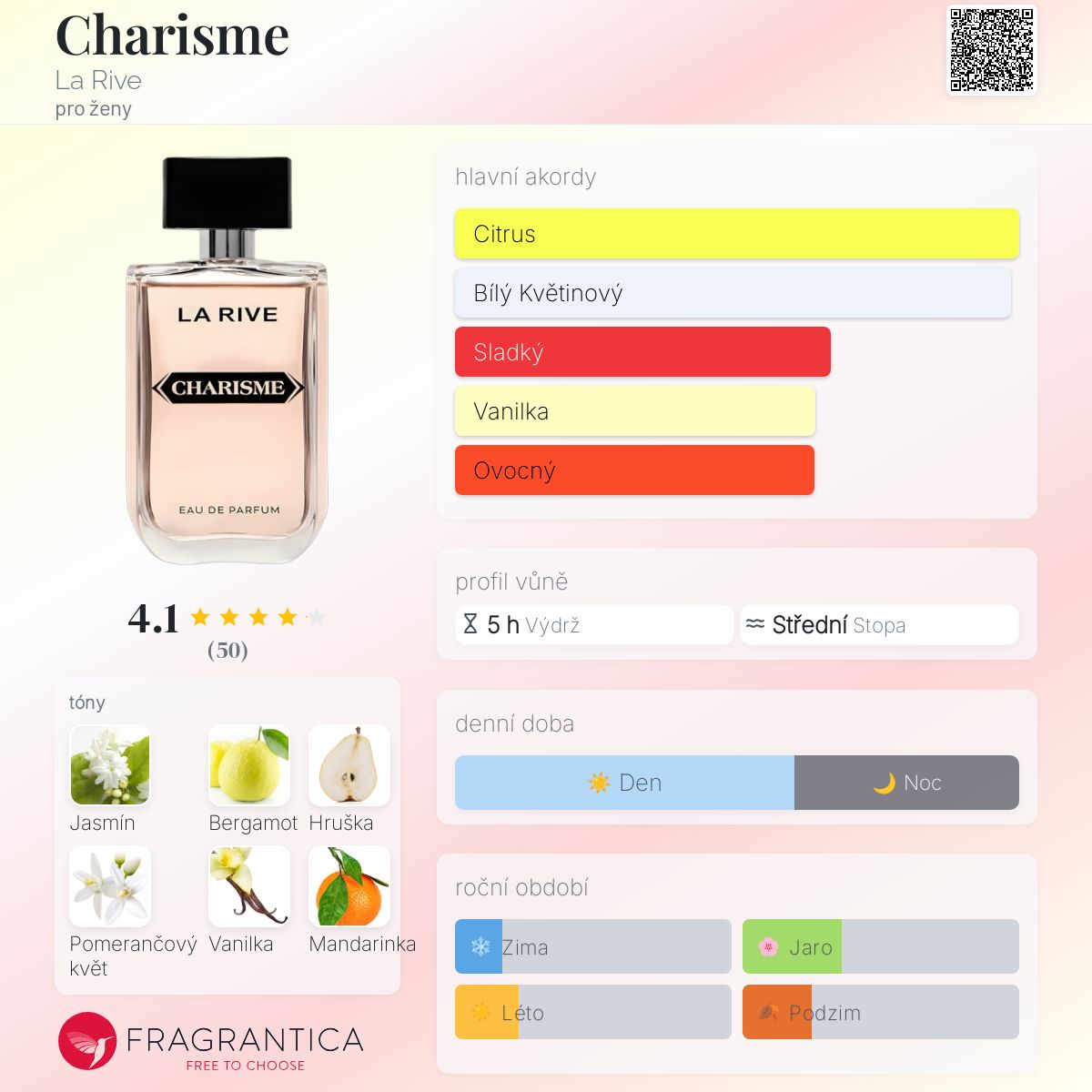 Charisme podle La Rive je Floral vůně pro ženy. Toto je nová vůně. Charisme byl/a uveden/a v roce 2024. Vrchní tóny jsou Bergamot, Hruška a Mandarinka; střední tóny jsouJasmín, Pomerančový květ a Květ hořkého pomeranče ; základní tóny jsou Vanilka, Ambra a Benzoin.