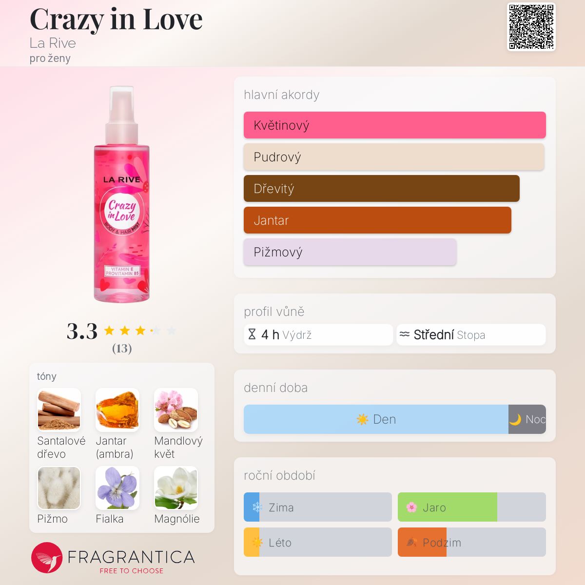 Crazy in Love podle La Rive je Orientální Floral vůně pro ženy. Crazy in Love byl/a uveden/a v roce 2022. Vrchní tóny jsou Mandlový květ , Zelený tón a Citrón; střední tóny jsouFialka, Magnólie a Třešňový květ ; základní tóny jsou Santalové dřevo, Bílý jantar (ambra) a Pižmo.