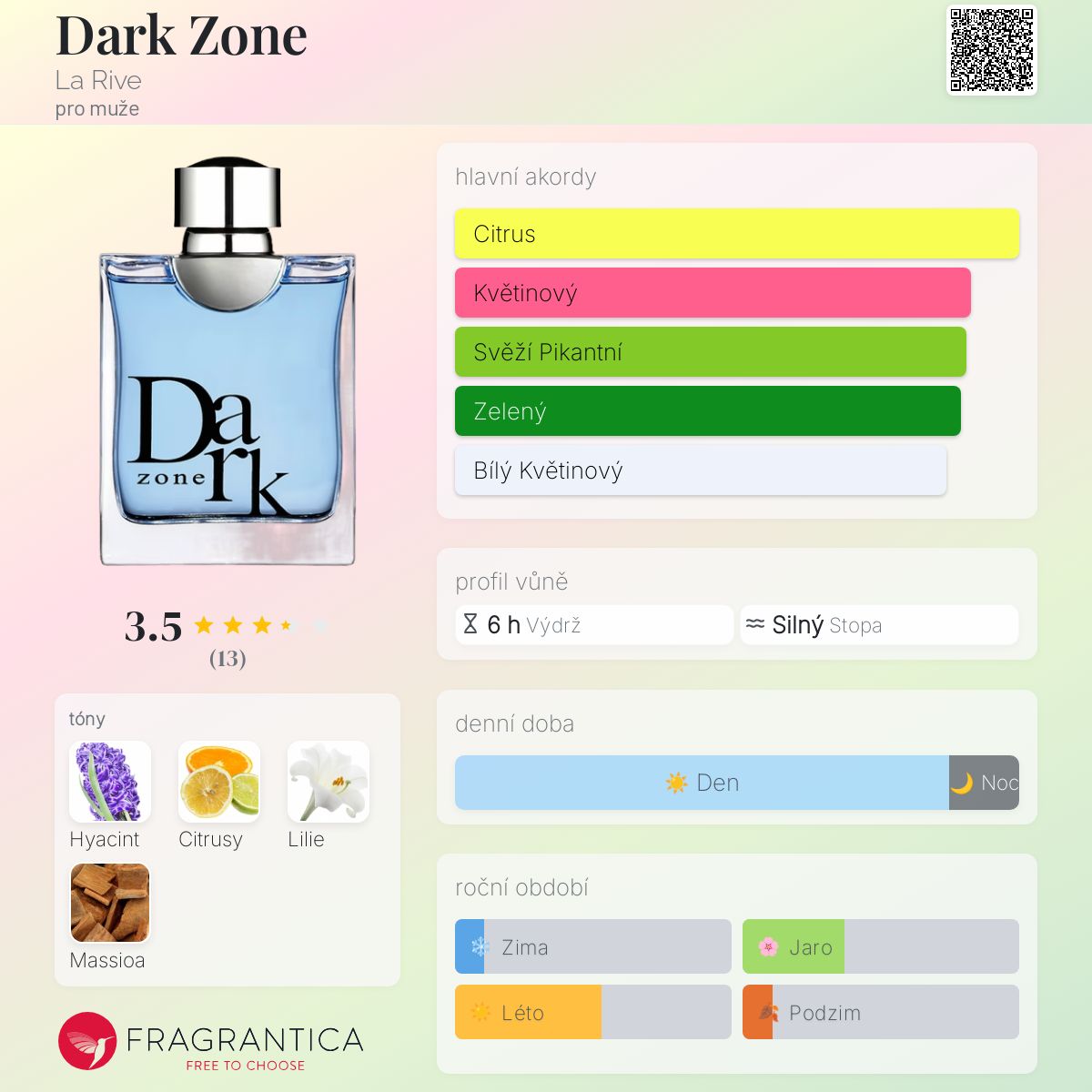 Dark Zone podle La Rive je Citrus vůně pro muže. Vrchní tón je Citrusy ; střední tóny jsouHyacint a Lilie ; základní tón je Massoia.