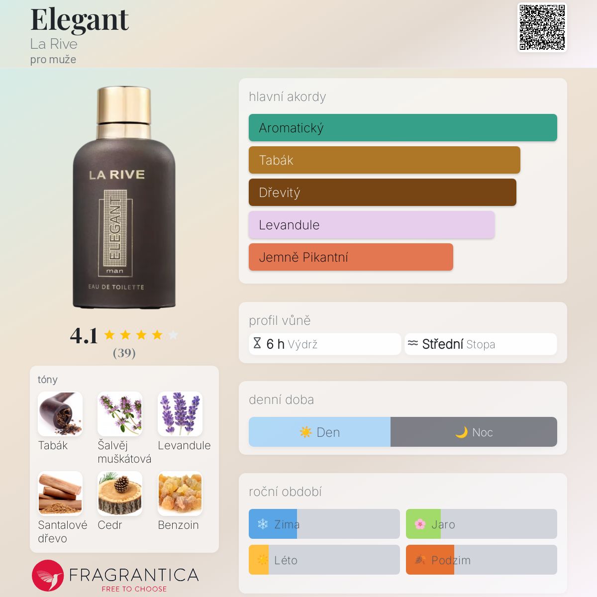 Elegant podle La Rive je vůně pro muže. Elegant byl/a uveden/a v roce 2015. Vrchní tóny jsou Šalvěj muškátová a Levandule; střední tóny jsouSantalové dřevo a Cedr ; základní tóny jsou Tabák a Benzoin.