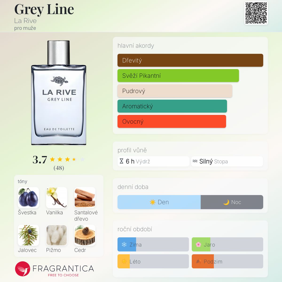 Grey Line podle La Rive je Citrus Aromatic vůně pro muže. Vrchní tóny jsou Švestka, Bergamot a Grapefruit; střední tóny jsouJalovec, Skořice a Pepř ; základní tóny jsou Vanilka, Santalové dřevo, Pižmo a Cedr.